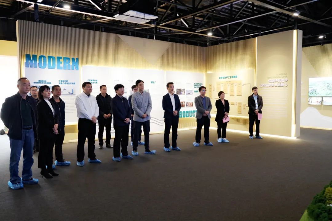 ▲園豐集團(tuán)總裁潘夏雨(前排右五)陪同自治區(qū)生態(tài)移民發(fā)展中心黨委書記、主任羅試堅(jiān)(前排左五)、副主任杜勇(前排右一)、市鄉(xiāng)村振興局局長龍家魁(前排左四)、縣委常委、副縣長梁浩成(前排右四)參觀靈山香雞示范區(qū)展示廳