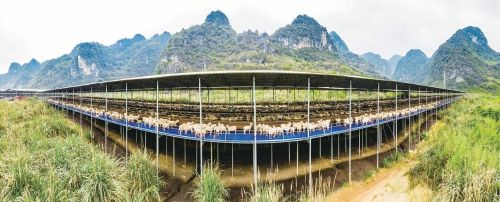 河池市都安縣地蘇鎮(zhèn)拉棠村澳寒羊養(yǎng)殖基地內(nèi),“牛羊上樓”養(yǎng)殖模式一景。 本版圖片除署名外均由廣西農(nóng)業(yè)農(nóng)村廳提供